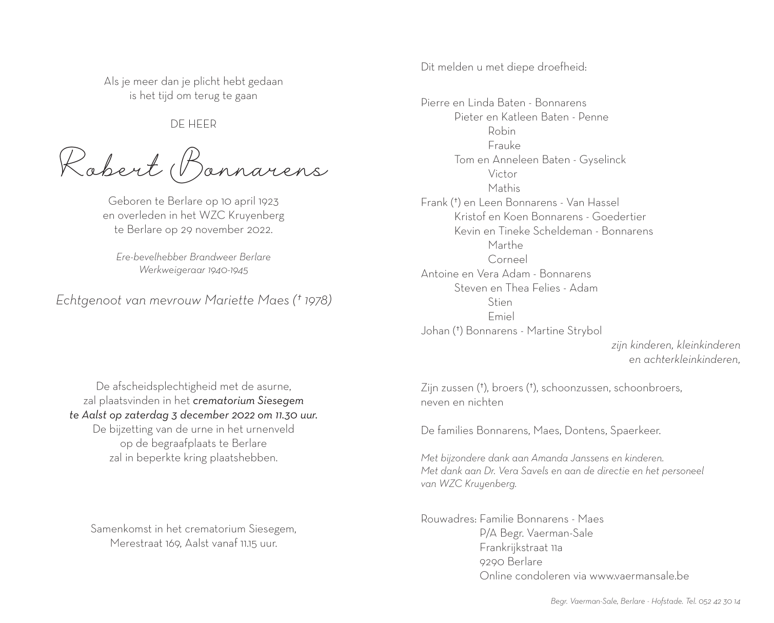 Overleden te Berlare (9290) op dinsdag 29 november 2022 op 99-jarige leeftijd