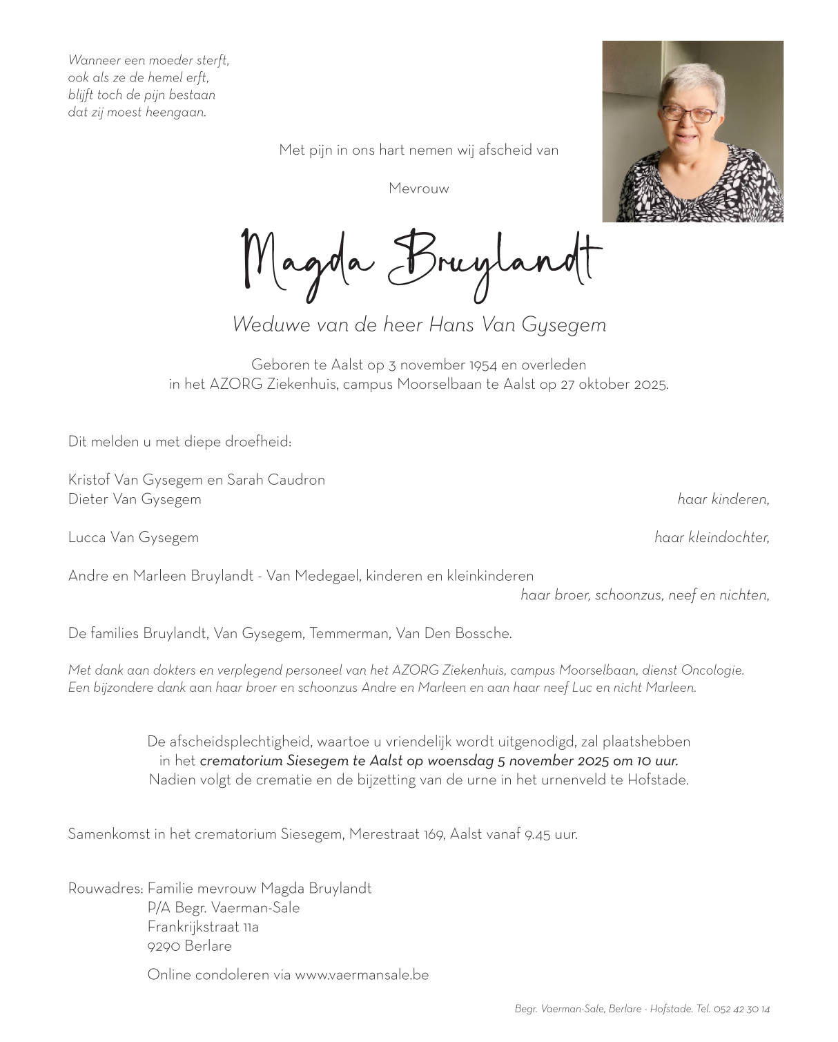 Overleden te Aalst (9300) op maandag 27 oktober 2025 op 70-jarige leeftijd