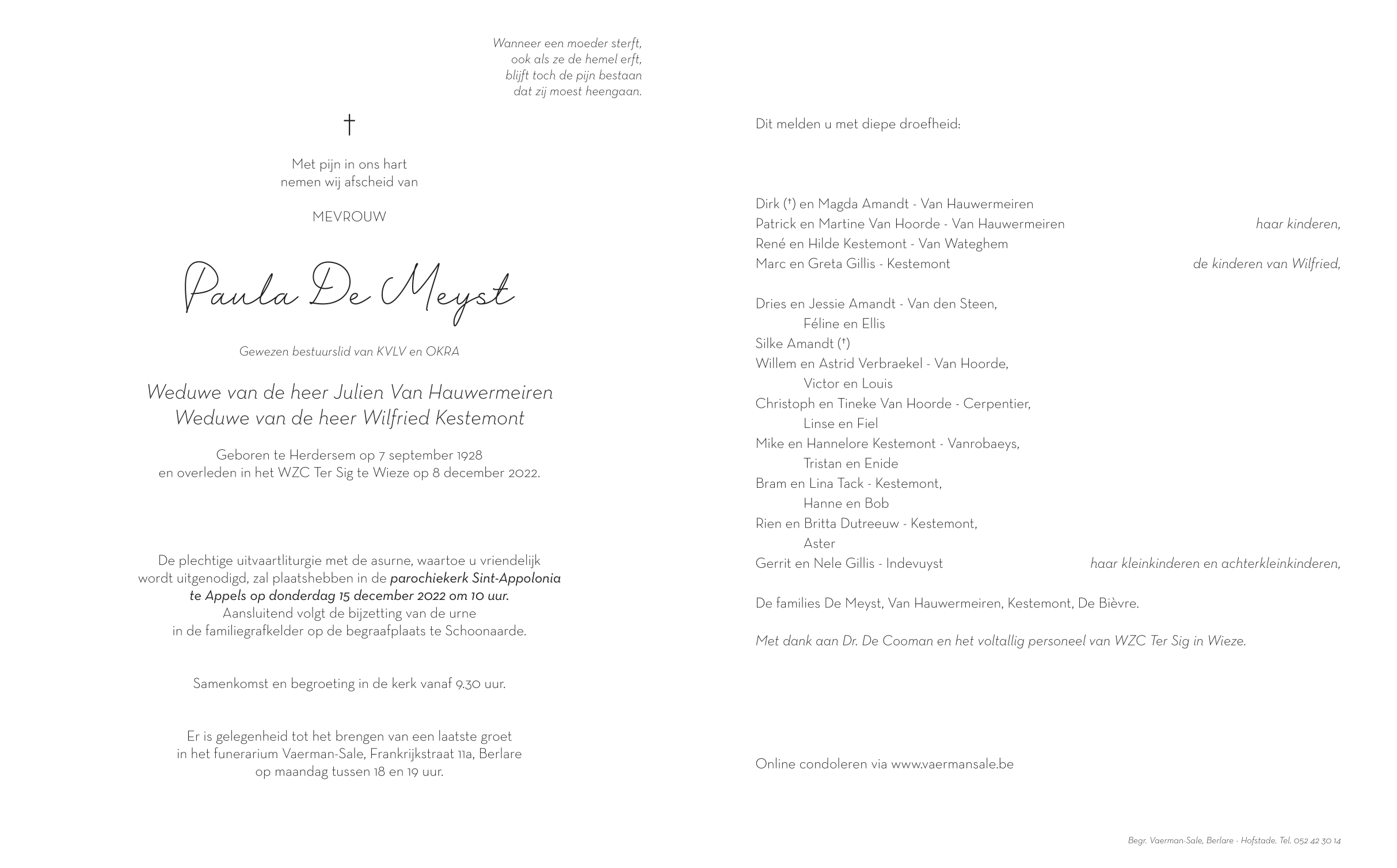Weduwe van Mijnheer Julien Van Hauwermeiren