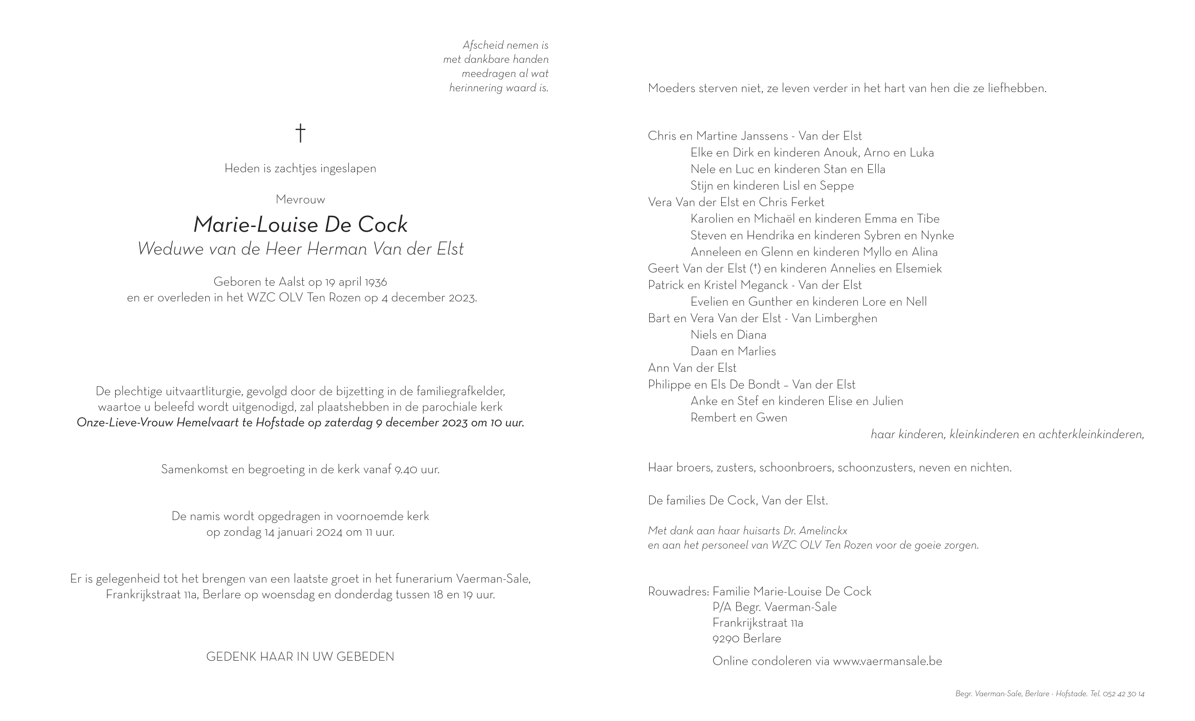Overleden te Aalst (9300) op maandag 4 december 2023 op 87-jarige leeftijd