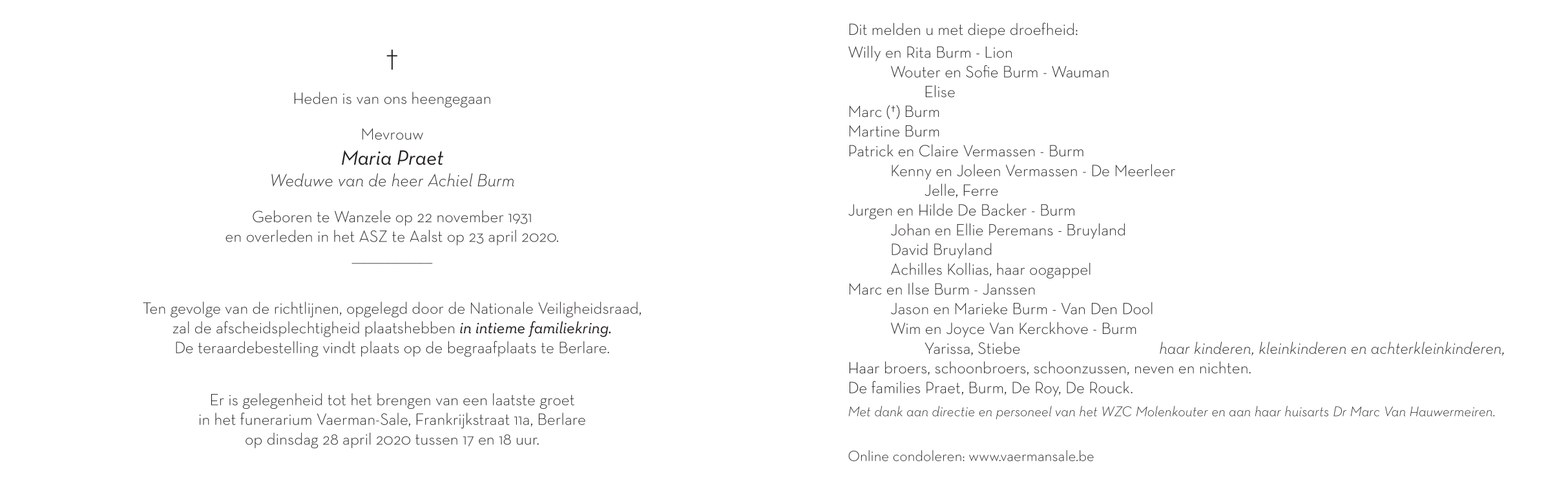 Overleden te Aalst (9300) op donderdag 23 april 2020 op 88-jarige leeftijd