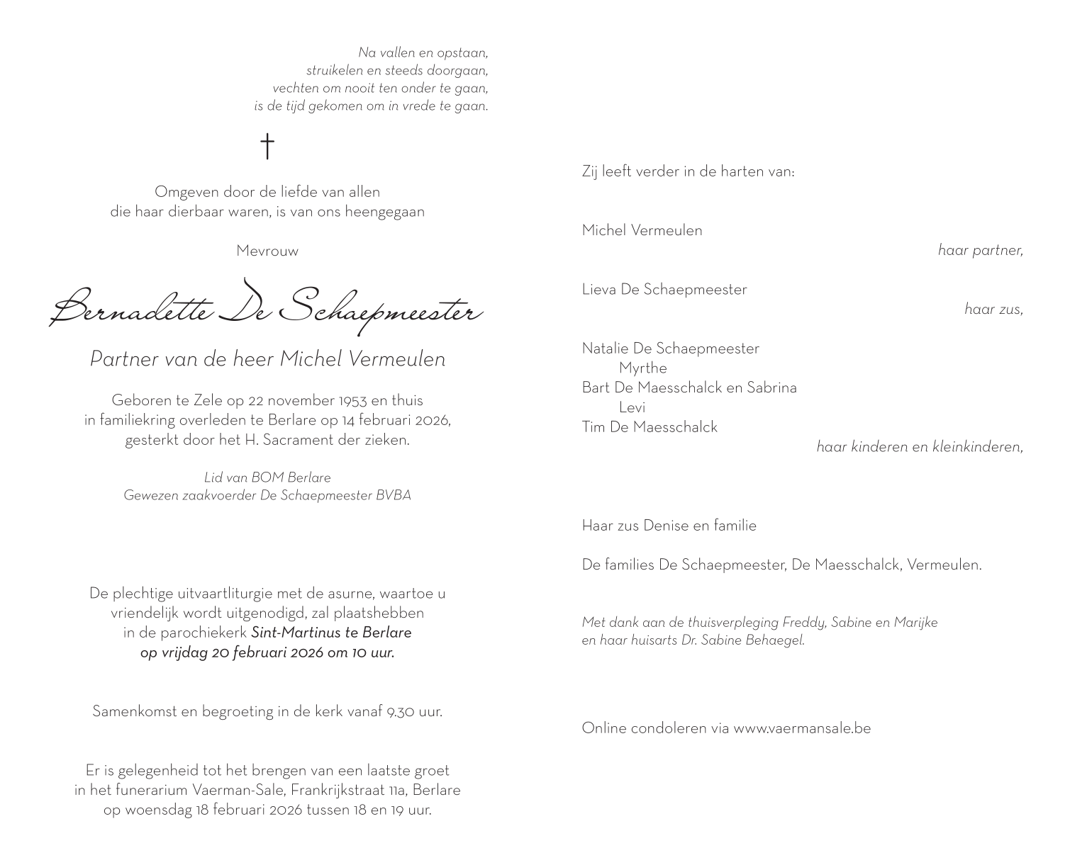Overleden te Berlare (9290) op zaterdag 14 februari 2026 op 72-jarige leeftijd