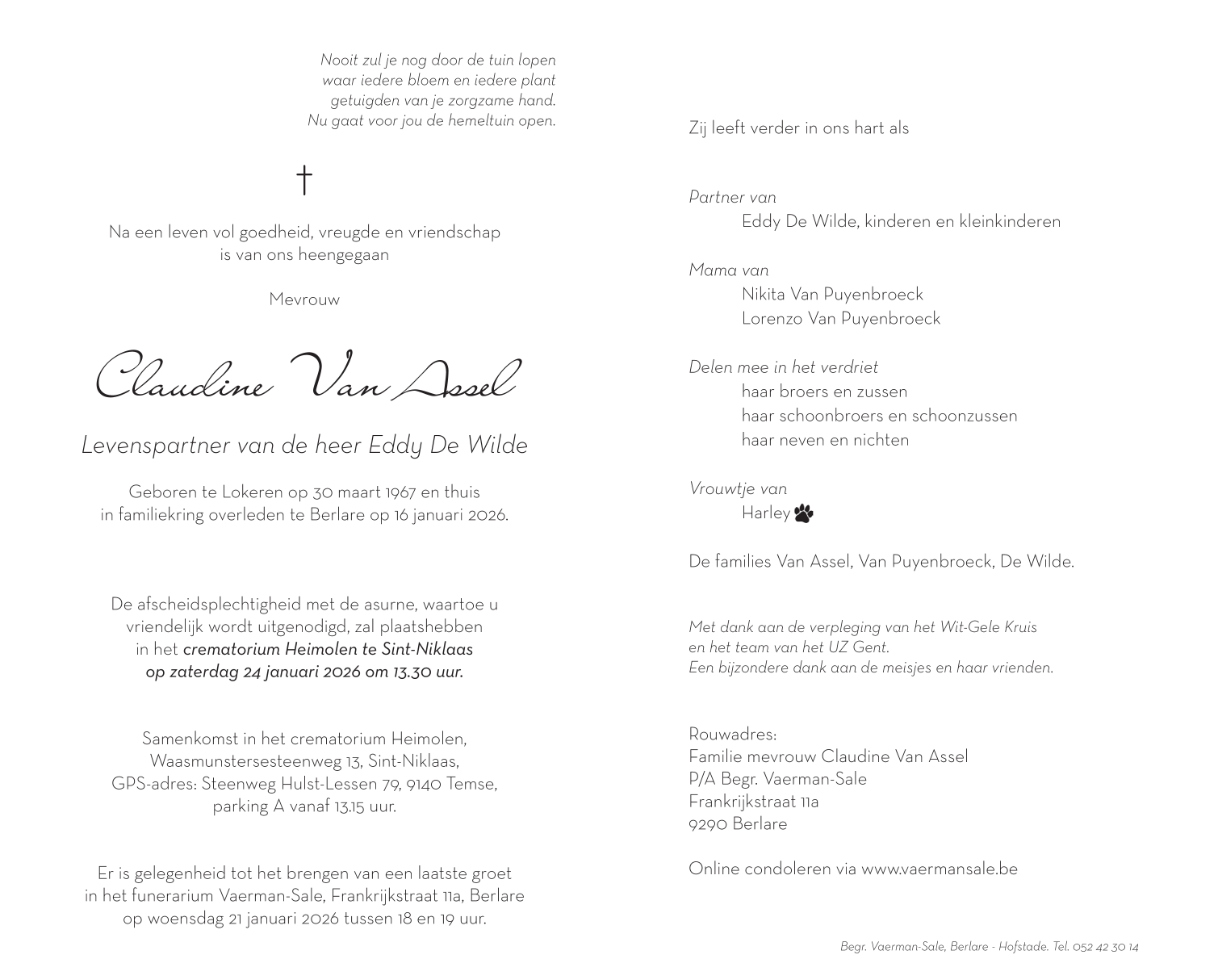 Overleden te Berlare (9290) op vrijdag 16 januari 2026 op 58-jarige leeftijd