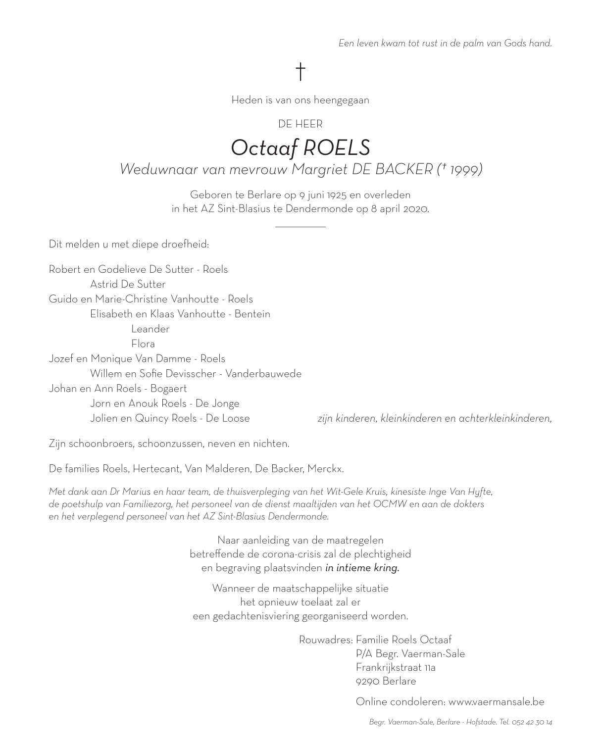 Overleden te Dendermonde (9200) op woensdag 8 april 2020 op 94-jarige leeftijd